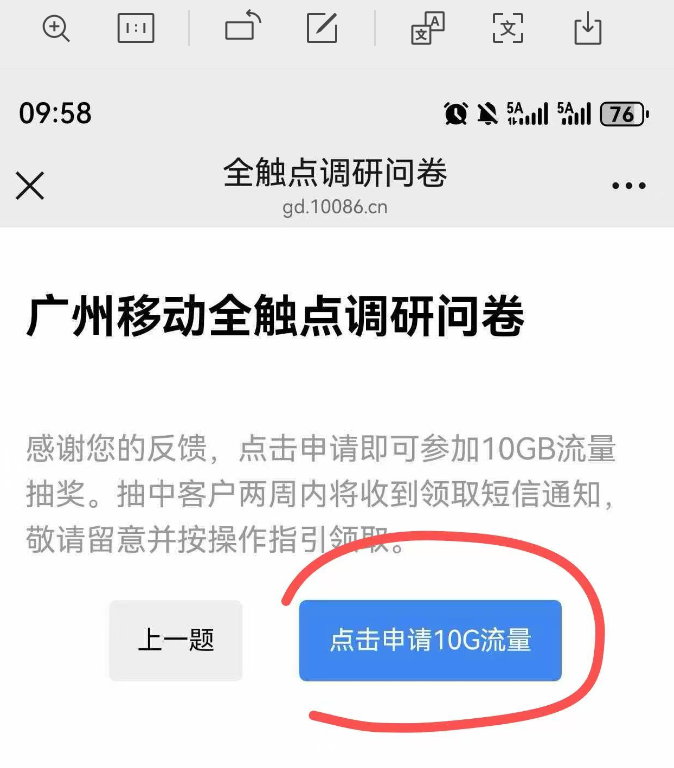“扫这里,服务反馈,码上有礼!”在摊位前,工作人员引导着市民快速操作。来自佛山的陈女士带着孩子驻足体验:扫描二维码后,手机页面自动跳转至“广州移动全触点调研问卷”页面,点击“点击申请10G流量”,系统瞬间完成审核,10G流量包即时到账。
